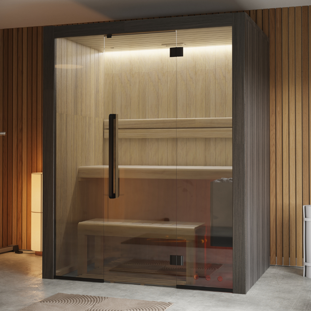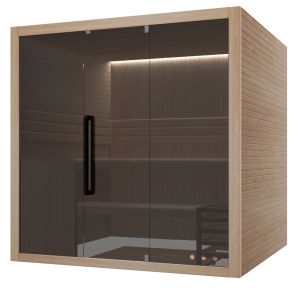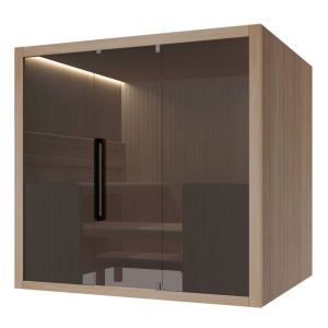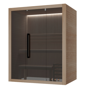 A Thermowood, a nossa madeira 100% natural, tratada sem produtos químicos, utilizada para fabricar as nossas saunas interiores, é segura e duradoura, além de ter uma aparência atraente. Os nossos modelos tradicionais têm um estrado integrado, coberta por uma superfície de vinil, que tem em conta a segurança e a estética com uma aderência antiderrapante. A frente de vidro cinzenta envolve o espaço e cria uma panorâmica especial.